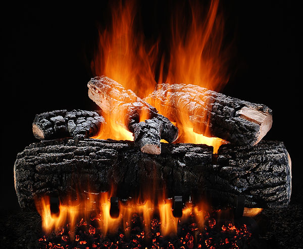 The Blazing Pecan features a massive front log with deep bark texture and detailed charred areas