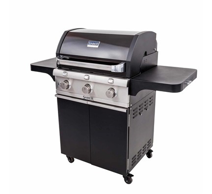 The SABER Cast Black 3-Burner Gas Grill comes with a more reliable ignition system featuring electrodes at each burner, grate-level temperature gauges and sturdy cart design. It also features a black porcelain lid with cast-aluminum end-caps and a black powder-coated cabinet. Plus, enjoy a double-access door and sturdy shelves with tool holders.